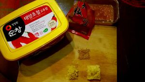 取一干净无油无水的盆,将姜蒜末,虾粉,橙子酱,辣椒粉,鱼露和韩式辣椒酱混合均匀。