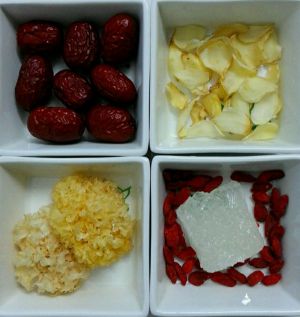 其中食材全部洗干净后,进行泡制(全部冷水泡制):银耳至少泡1小时,百合泡30分钟,红枣泡30分钟,只有枸杞泡10分钟即可;