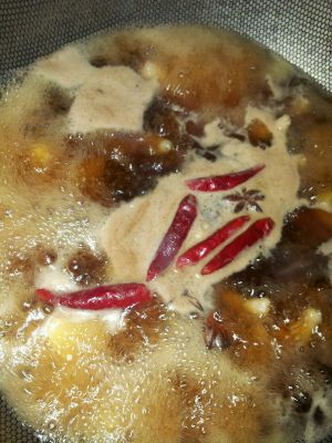 锅中加清水,将鸡爪放入锅中,水要没过鸡爪。在锅中加入干红辣椒、八角、生姜、黄酒、酱油、盐、醋。开大火煮15~20分钟,用筷子戳下,鸡爪能戳破就关火。