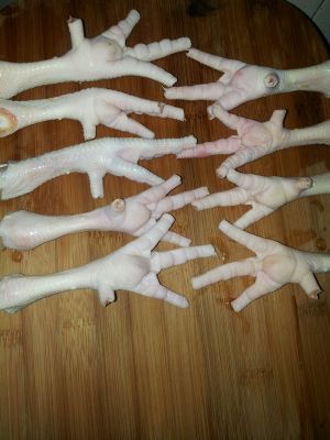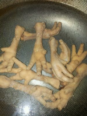 将煮好的鸡爪用冷水洗干净,然后用冷水浸泡鸡爪十分钟。