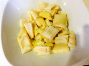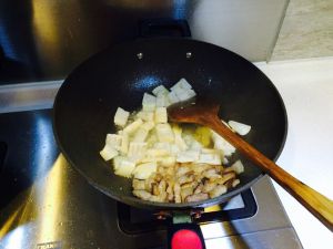 五花肉不用捞起,直接留在锅里一旁待用,姜蒜下锅炒香后,直接下苦笋爆炒