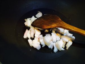 五花肉下锅,小火煸至金黄。(五花肉最好先用开水烫,会比较好切哦)