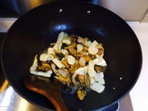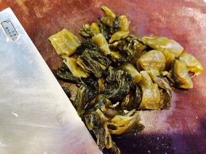 蚝干酸菜下锅,和五花肉一起翻炒,之后加水