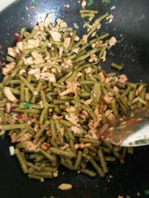 鸡肉翻炒至发白倒入酸豆角,翻炒两分钟左右