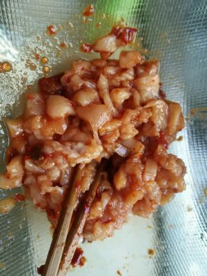 鸡胸肉切成小块,倒入料酒,生姜,和郫县豆瓣酱,腌制五分钟左右