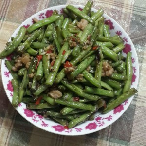 热锅上油,油热后倒入四季豆翻炒至表面起皱后捞出;