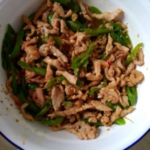 用锅里剩余的油放入姜 蒜爆香 倒入青椒炒至半熟 倒入肉丝翻炒