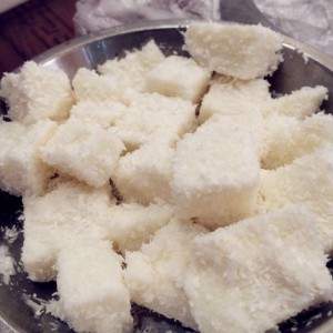 用100ml热水将糖融化,加入沸腾的椰奶中。
