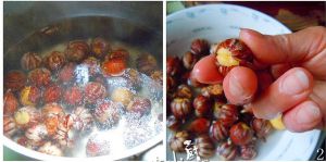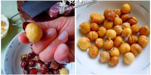 用手拿住粟子,一捏,粟子就整个从粟皮中脱出来了,简单又快速。剥好的粟子放盆内备用。