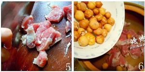 将新鲜猪瘦肉洗净切小块。汤锅内放适量的清水,放入瘦肉、板粟,开大火煮开。