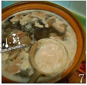 煮开后,用汤勺将浮沫撇去。再转小火慢慢煲1.5个小左右,关火前5分钟加盐即可。