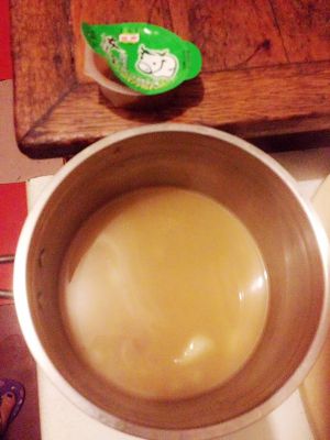 一份浓汤宝取一半,煮土豆的水留一点,放入浓汤宝煮化,浓汤宝的口味可以自己选择,喜欢口味重一点的就整个都放进去,水的多少也是自己决定,喜欢土豆泥稀一点的就多留点,喜欢稠一点的就少留点,稀一点的一个小奶锅锅底就够了,稠一点的就有一点水能把浓汤宝化开就好。