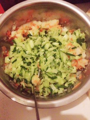 黄瓜也切小丁,先把土豆碾成泥,把过完油的胡萝卜丁和黄瓜丁还有浓汤宝水一起放入,搅拌均匀。
