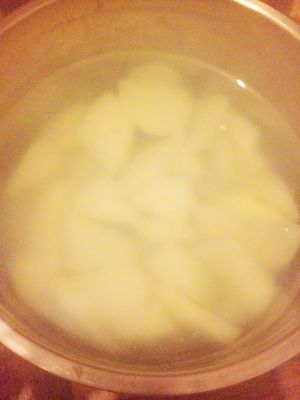 切好的土豆放在水里煮熟,不要煮烂哦。