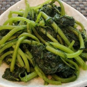 冷锅热油,待油热后倒入沥干水分的茼蒿菜翻炒。