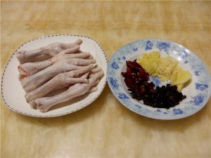 将鸡爪洗净切掉鸡指甲,姜一半切片,一半切末,蒜切末,干辣椒切段,豆豉洗净。