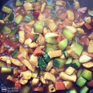 然后辣椒,黄瓜,火腿依次下锅翻炒,再加入鸡丁,炒一会后把兑的汁倒进去,我淀粉倒多了一点有点稠所以又再加了点水,最后烧一会收汁就起锅了,我忘了买花生米,喜欢的可以放进去一起炒