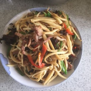 木耳泡发和高笋一样切丝,青红椒切丝。