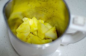 把西瓜及适量糖放进果汁机搅碎。如果有果汁分离机更加好处理。