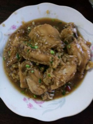 鸡翅洗净后放进高压锅中,高压锅中倒入半瓶啤酒,一勺盐,五克白糖,一勺酱油,20克糯米。焖煮10分钟。