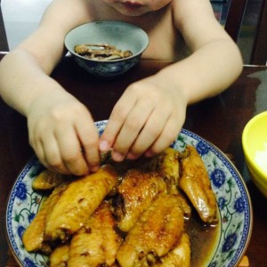 鸡翅水煮5分钟捞出,两面用刀扎眼或划口,放入不粘锅不放油煎至金黄。