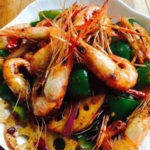 比炒菜略多的油,放虾煎炒30秒,依次加入姜、蒜、洋葱、藕片炒30秒