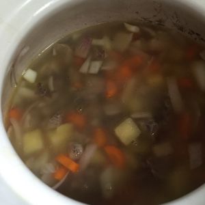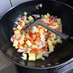 土豆、洋葱、胡萝卜切成丁放一点油翻炒一下去去水味;