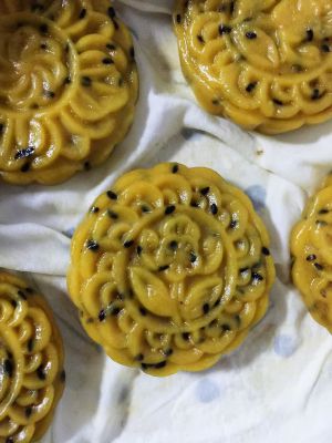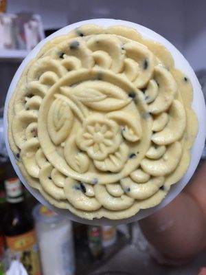 南瓜洗净切块蒸熟后料理机打成泥,加入面粉和糯米粉和成面团,分成若干个约30克的小份搓圆后压扁中间凹进去放入凤梨馅(自己用凤梨、冬瓜、蜂蜜和麦芽糖制成的凤梨馅,也可用豆沙或别的馅做不同的口味)搓圆压扁入月饼模具,模具内事先刷层油可防粘。