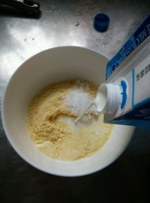 将所有材料倒在一起,糖的量自己掌握就好,牛奶一点一点的倒在面粉里。
