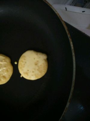 小火烙,等表面开始凝固了,用勺子跟筷子一起翻面,等面饼稍硬就可以出锅了