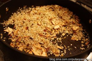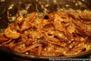 蒜末呈金黄色后,放入牛肝菌菇,稍微小炒一下;