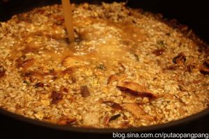 在倒入第五次的蔬菜精后,可以将事先做好的牛肝菌菇也放入米饭中,一起烩;
