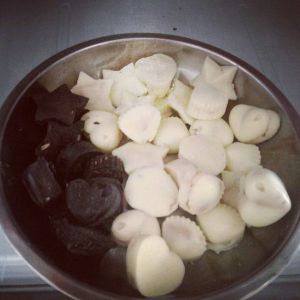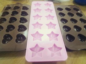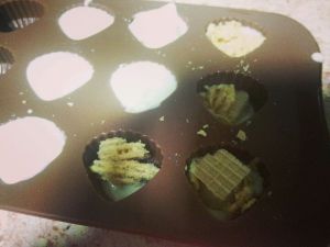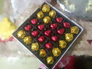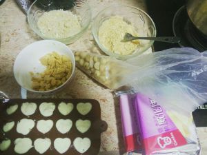 巧克力隔水融化了放一点点在模具上,加上喜欢吃的果仁或者弄碎的威化饼,再加上融化了的巧克力。注意:不要放太多陷,再加巧克力就会流出来,做出来就不好看了。