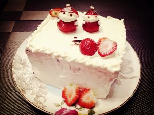 蛋糕四等分,每一份中间铺上草莓和奶油,最后表层涂满奶油抹平,将圣诞老人摆上,撒上适量糖分营造下雪效果。这个步骤忘记拍了。收工!