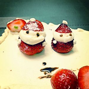 草莓切开上下两部分,中间挤上奶油,再用奶油和巧克力酱装饰眼睛、帽尖和手,做好后摆在蛋糕上。