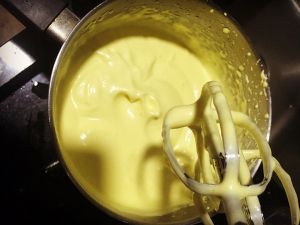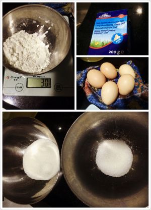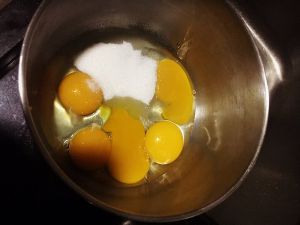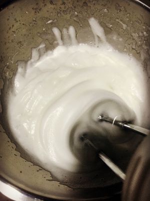 三个蛋白,两个全蛋,100g砂糖打发,时间大概五分钟!