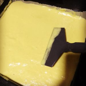 面糊倒入烤盘摸平,用手拍打烤盘底部把气泡震出来。