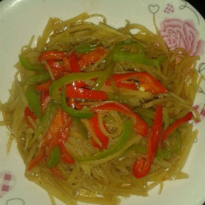 先后放入土豆丝、青红辣椒丝翻炒片刻。
