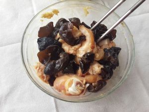 6,把木耳和鸡肉拌在一起。(鸡皮下后脂肪,所以这道菜可以不加油。)