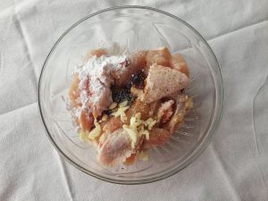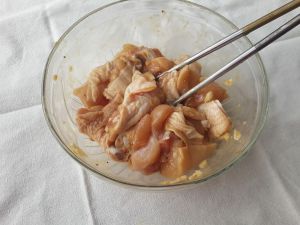 1,鸡洗好,砍小块,加调味料。