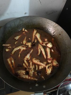 炒锅加少许油,郫县豆瓣,花椒,辣椒,八角,酱油炒出香味,倒入鸡爪,翻炒上色,加水,可以加多一些。盖上锅盖,烧开。