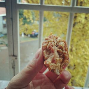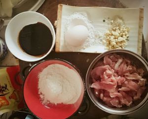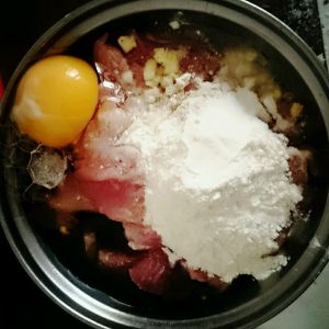 鸡蛋,淀粉,面粉,胡椒,姜蒜,盐,生抽老抽,加入猪肉搅匀!