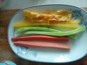 备好香肠,黄瓜,鸡蛋皮,调味萝卜,切条备用