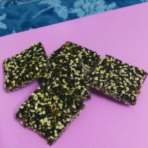 将芝麻移至事先准备好的干净面板上,趁热用擀面杖擀平,切块。