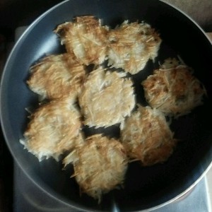 土豆,擦成丝,芥菜头擦成碎末,葱切碎,有了芥菜头就不用加盐了!