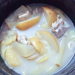 锅洗净,放入洗干净的排骨,苹果和雪梨,我用的是法琅铁锅,煮汤很快的,汤特别浓原汁原味。