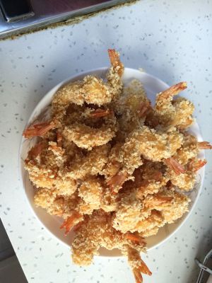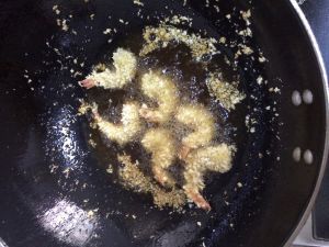 锅里加入适量的油,小火,油烧到丢进粘了鸡蛋的面包糠下去就起泡泡就可以了。一定要一个一个的放进去,注意火候,大了就不好了!用长筷子翻身,也可以防止被热油溅到。油炸一两分钟也就可以,虾很好熟的!