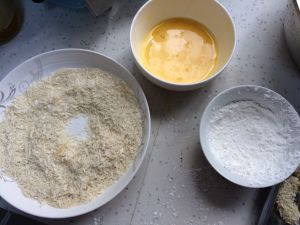 将淀粉,两个鸡蛋,面包糠,分别放在两个碗和一个碟子里备用。