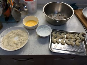 拿着虾尾巴,依次沾淀粉、鸡蛋、面包糠,然后一个一个摆盘备用。
