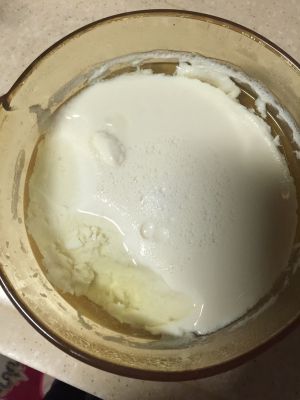 在一个盆子里面放上3g内脂,将煮好的豆浆倒进去,迅速搅拌一下把内脂溶化